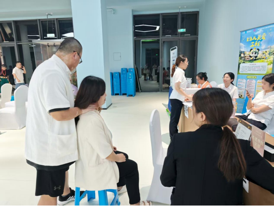 而在肩颈推拿指导区,王冬雪专家现场示范简单实用的推拿手法,教大家如何通过自我按摩缓解肩颈酸痛等不适,大家也学得认真,现场互动频繁。