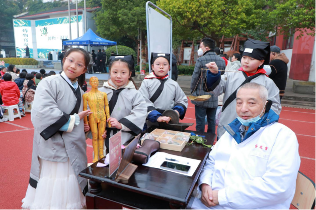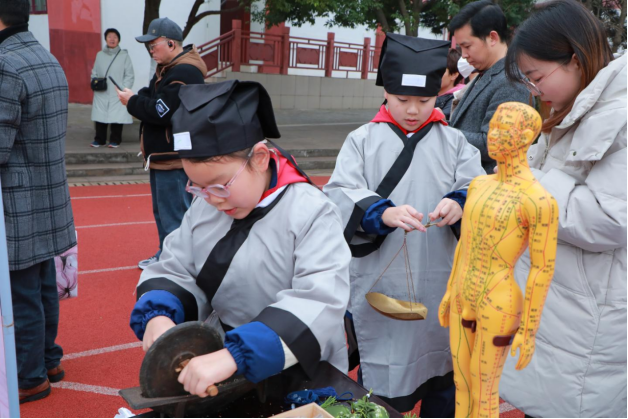 他们熟练地拿起薄荷、艾草、金银花等中药材,用精巧的药碾细心研磨,精准使用小秤称取药材分量,清晰地讲解每种药材的名称、外观特征及功效;在把脉和识穴位展示环节,小讲师们对照穴位人体模型,精准定位合谷、足三里等常见穴位,并演示正确的按压方法。孩子们的一举一动有模有样,引得现场阵阵掌声,充分展现了中医文化在校园传承的生动实践。