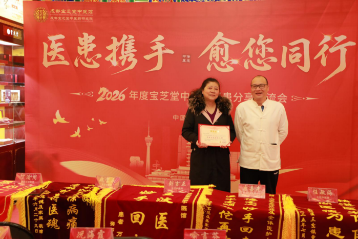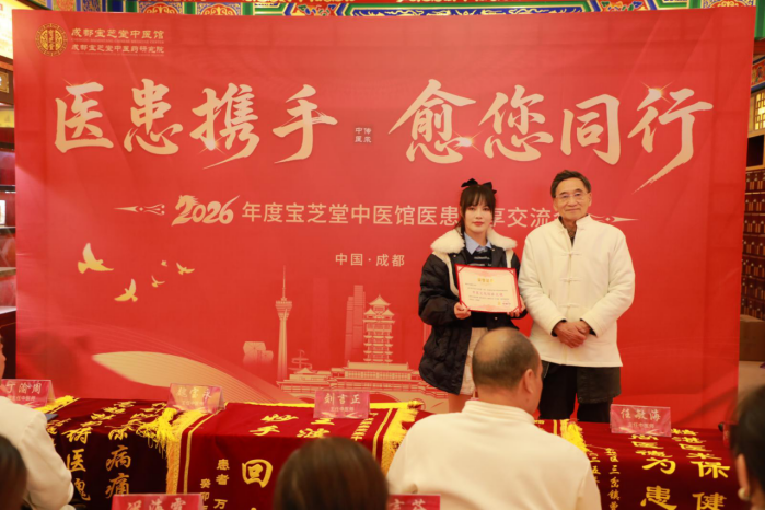 同时,为感念患者朋友们对中医文化的信赖与热忱传播,成都宝芝堂中医馆为每一位登台分享的患者郑重颁发了 “中医文化传承大使证书”。当承载着认可与期许的红色证书送到患者手中时,现场掌声雷动、暖意融融。